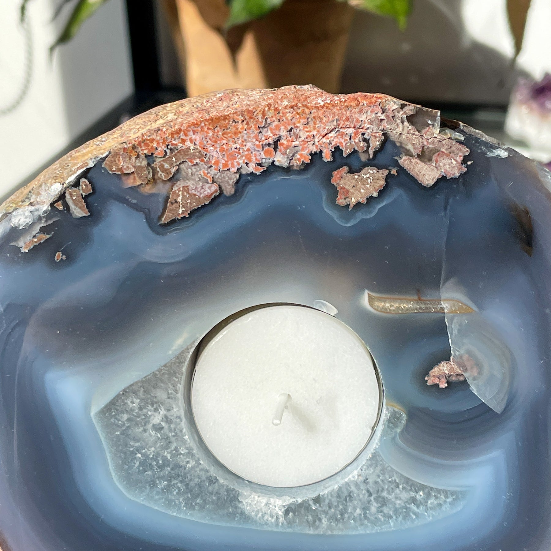 Agaat is een variëteit van kwarts en een veelvoorkomend mineraal in de aardkorst. Het is een microkristallijne steen met een gestreept, gevlekt of bont uiterlijk en komt in verschillende kleuren voor, zoals wit, grijs, bruin, rood, groen en blauw. Deze agaat theelichthouder is niet gekleurd en bevat echt de natuurlijke kleuren.