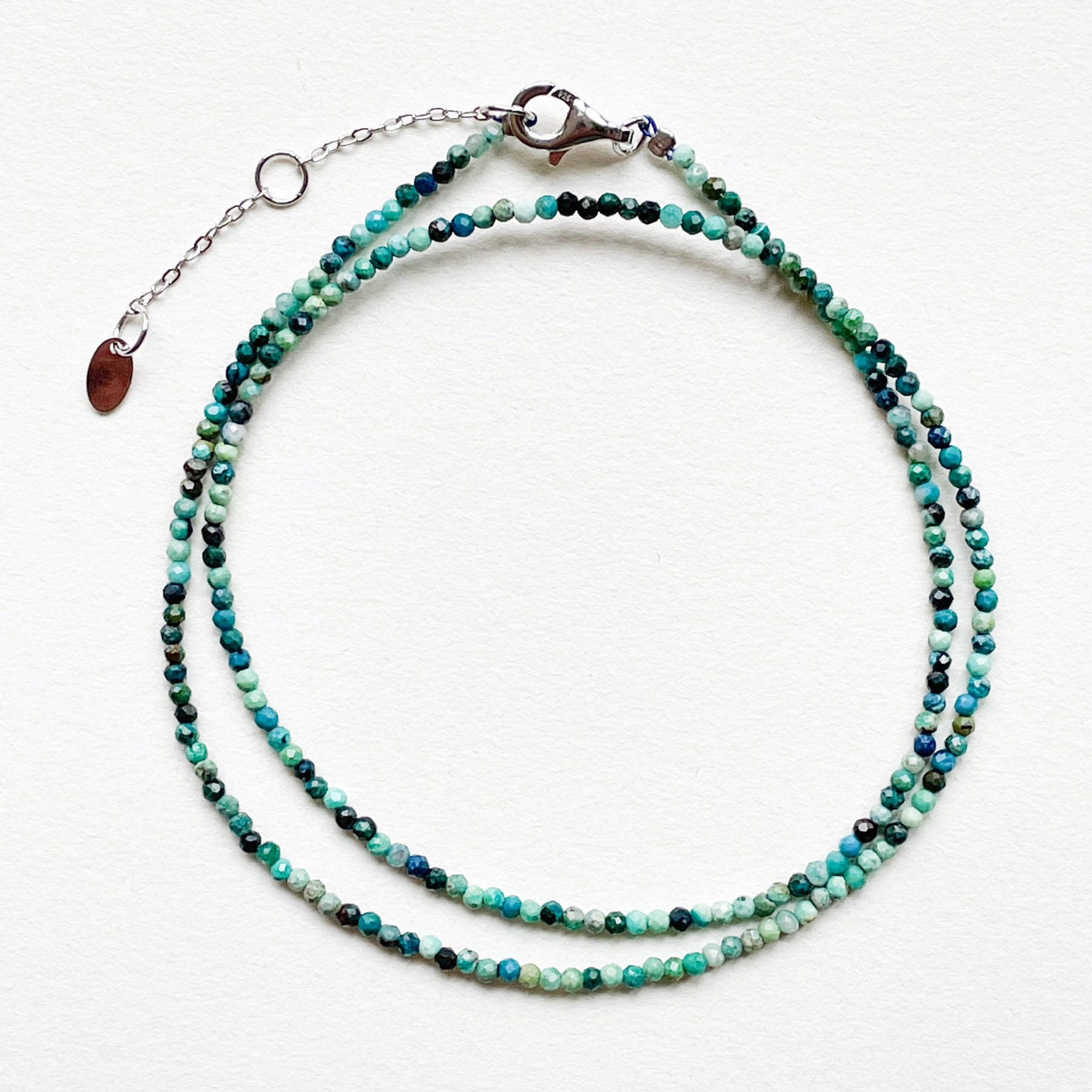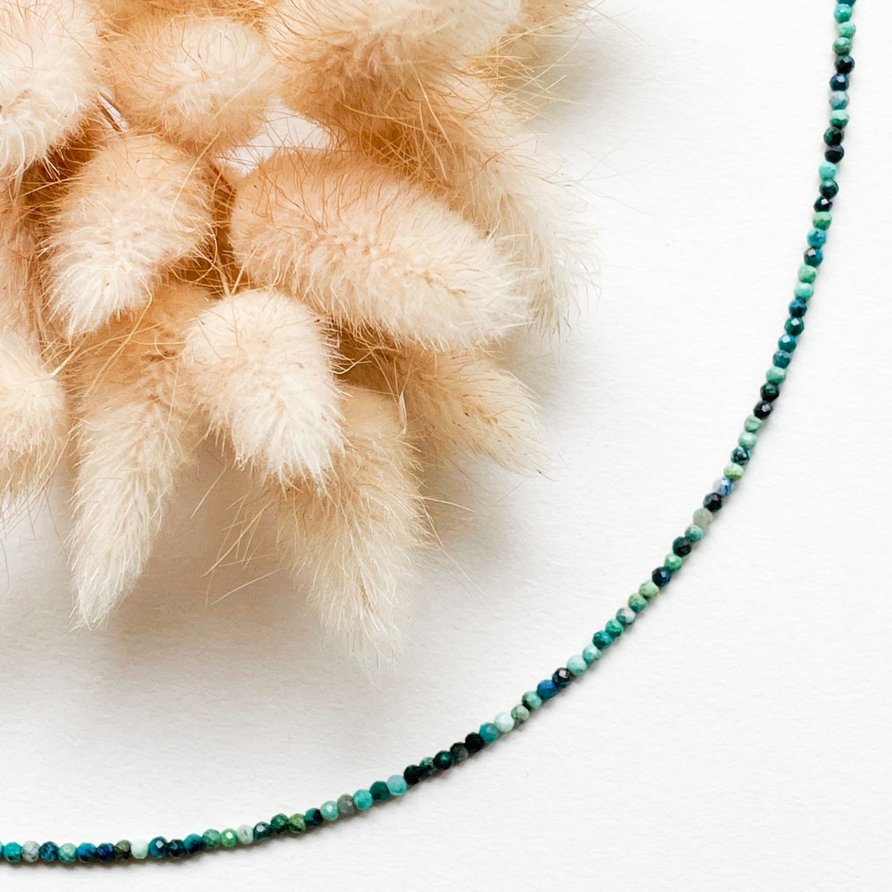 Deze chrysocolla ketting heeft fijne facetkralen (Ø3mm) die subtiel glanzen en de zachte groen blauwe kleur van de steen laten zien. Chrysocolla staat bekend om zelfexpressie, communicatie en kalmerende energie – een verfijnd sieraad met een mooie betekenis.