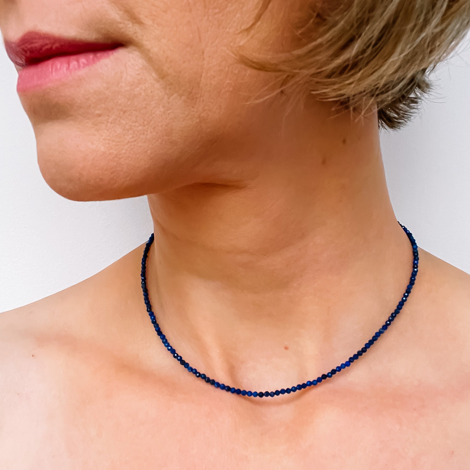 Deze lapis lazuli ketting heeft fijne facetkralen (Ø3mm) die subtiel glanzen en de zachte paarse kleur van de steen laten zien. Lapis Lazuli staat bekend om wijsheid, waarheid en zelfexpressie – een verfijnd sieraad met een mooie betekenis.